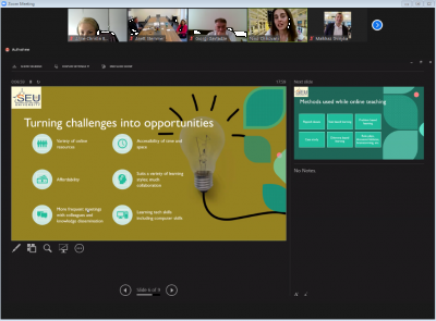 Im Rahmen eines virtuellen Workshops zum Thema "Research and teaching experience during the pandemic" trafen am 15. Juni 2021 Professor*innen und Mitarbeiter*innen der bbw Hochschule mit ihren Kolleg*innen der Georgian National University SEU zu einem Kennenlernen und Erfahrungsaustausch zusammen.